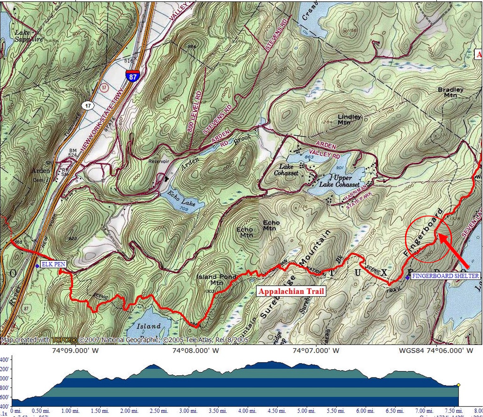 | Island Pond Campsite Harriman State Park NY (unofficial campsite) | This section starts at the Elk Pen is N41 15.875 W74 09.321 for those who have a GPS devise for their car. You are now in Harriman State Park. At 0.4 miles (from NY 17), the AT turns right and enters the forest, leaving the road. Follow the white blazes. | Map Pictures | ||